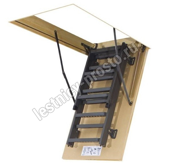 Герметичность всей конструкции достигается благодаря утеплению крышки люка и контурному уплотнению по периметру, что предотвращает возможные теплопотери. Чердачную лестницу очень легко разложить и сложить благодаря наличию специального стержня с четырехугольной насадкой. Установленные в лестнице угловые петли-шарниры нового образца придают ей высокую прочность и надежность, а также предохраняют короб от возможной деформации. Основное преимущество чердачной складной металлической лестницы LMS сводится к ее небольшим габаритам при сохранении высокой функциональности, прочности, надежности и эстетичности конструкции. Монтировать лестницу очень просто, для этого не придется затрачивать много времени и сил. Применение лестничной конструкции этого типа позволяет существенно экономить пространство. Монтажный комплект LXK в комплекте не поставляется.