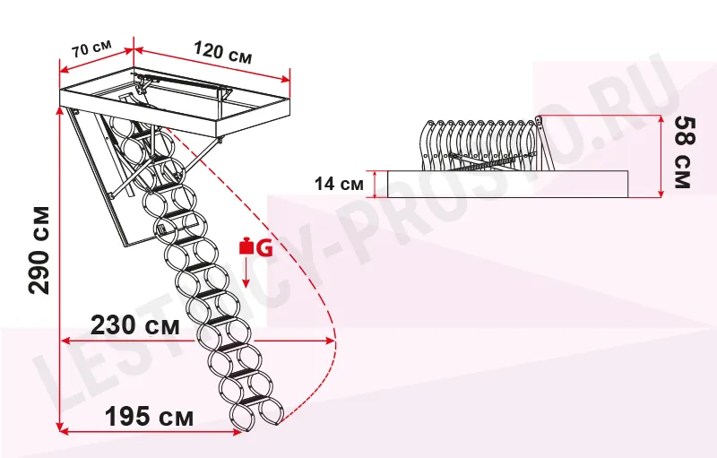 Все элементы лестницы выполнены из экологически чистых материалов и обработаны веществами, не содержащими тяжелых металлов. На ступенях антискользящие насечки. Короб лестницы изготовлен из металла. Термоизоляционная крышка типа "сэндвич" утеплена пенопластом, облицована с двух сторон ДСП белого цвета. Короб люка с уплотнителем. В комплекте деревянный стержень для открывания лестницы.