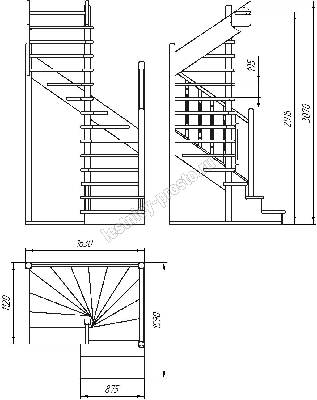 Деревянная межэтажная лестница ЛЕС-03 2915-3075 проем 1630-1120, Бук