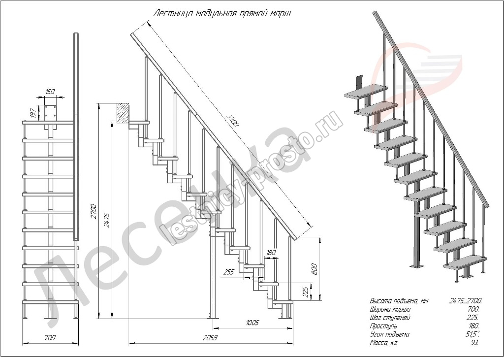 Модульная малогабаритная лестница Линия 2475-2700, Серый, Сосна, Нержавеющая сталь