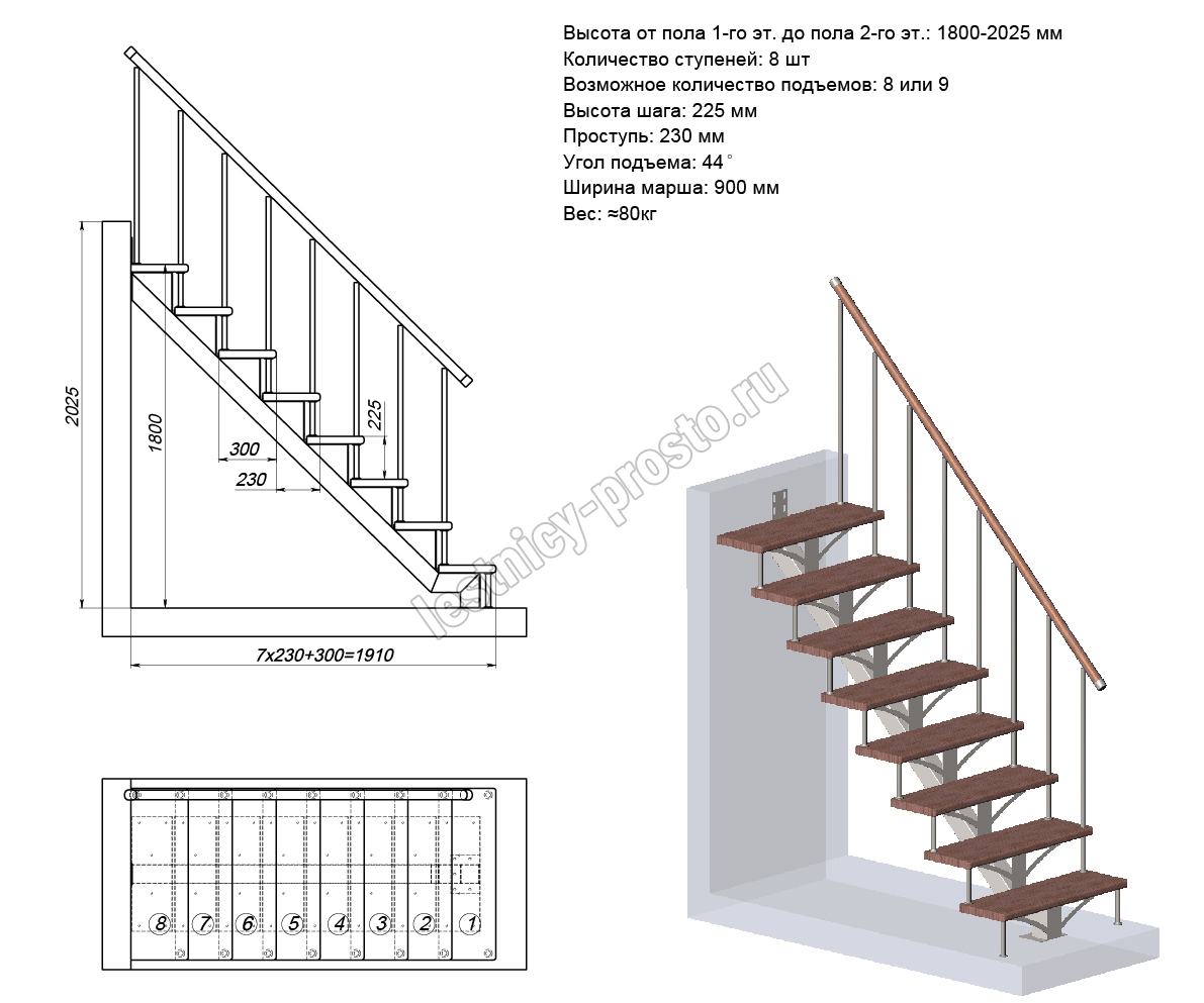 Лестница PROSTO MONO прямая, h202.5 см, ступени хвоя