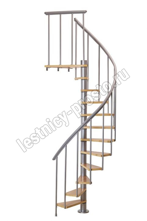 Ступени лестницы изготовлены из бука по технологии MULTIPLEX и покрыты износостойким защитным лаком. Лестница монтируется как по часовой стрелке, так и против. Возможен монтаж в круглый или квадратный проём. Ограждение: стальные трубки, Ø25 мм RAL 9006. Поручень: гибкий цельный ПВХ-поручень Ø40 мм серого цвета. Конструкция и балюстрада окрашены порошковым способом в серый цвет (RAL 9006).
