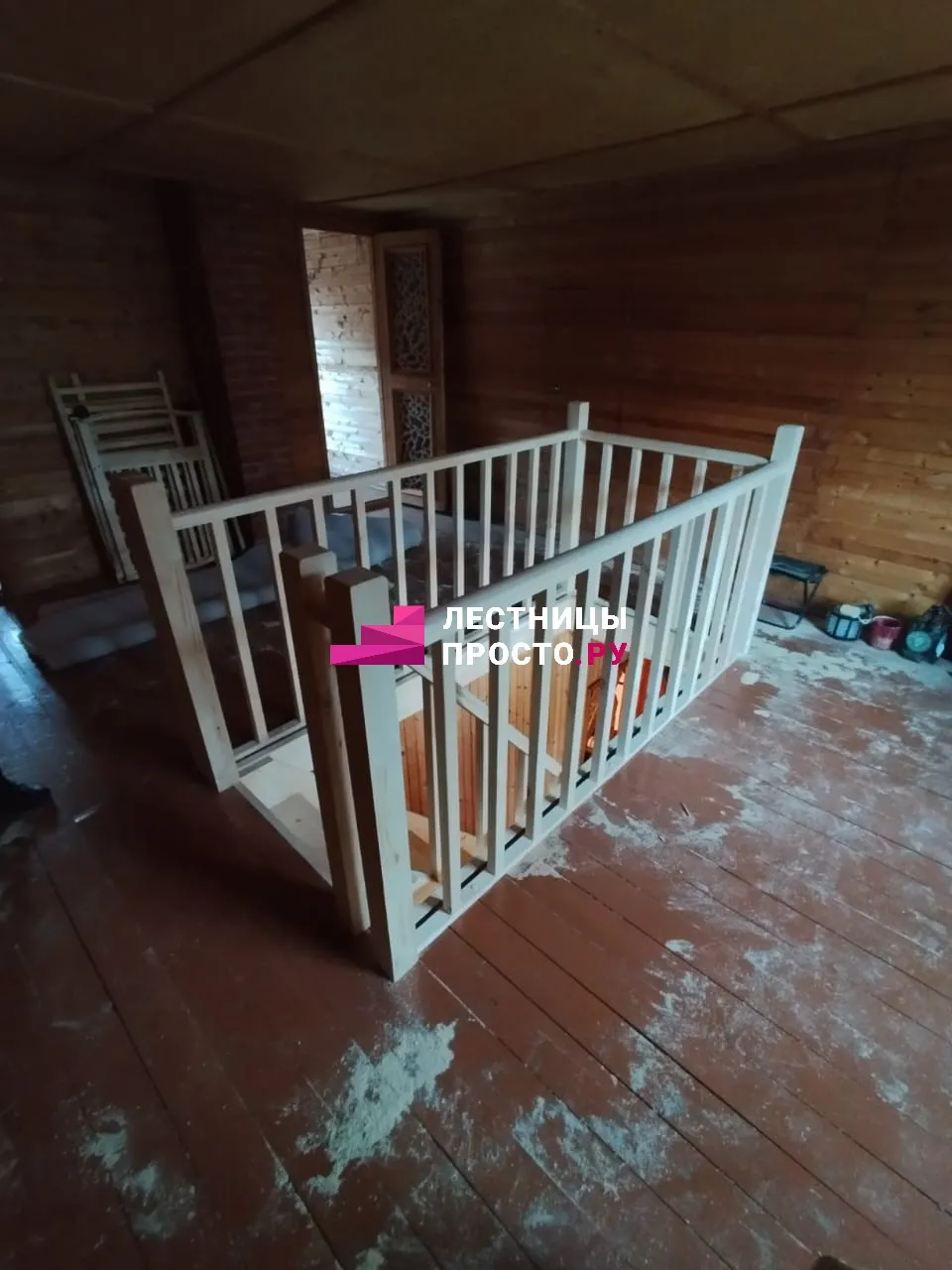 В рамках данного проекта мы не только установили лестницу, но и вырезали и выполнили обшивку проема, добавили балюстраду.